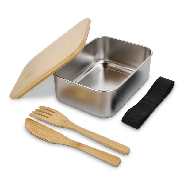 Deze RVS lunchbox met bamboe deksel is een stijlvolle en duurzame oplossing voor het meenemen van lunches, snacks of maaltijden onderweg, op kantoor of naar school. Het deksel wordt afgesloten met een elastische band, waarin ook een bamboe mes en vork bevestigd kunnen worden. Elke lunchbox wordt individueel verpakt in een geschenkdoos, waardoor hij zeer geschikt is als promotioneel artikel of relatiegeschenk.